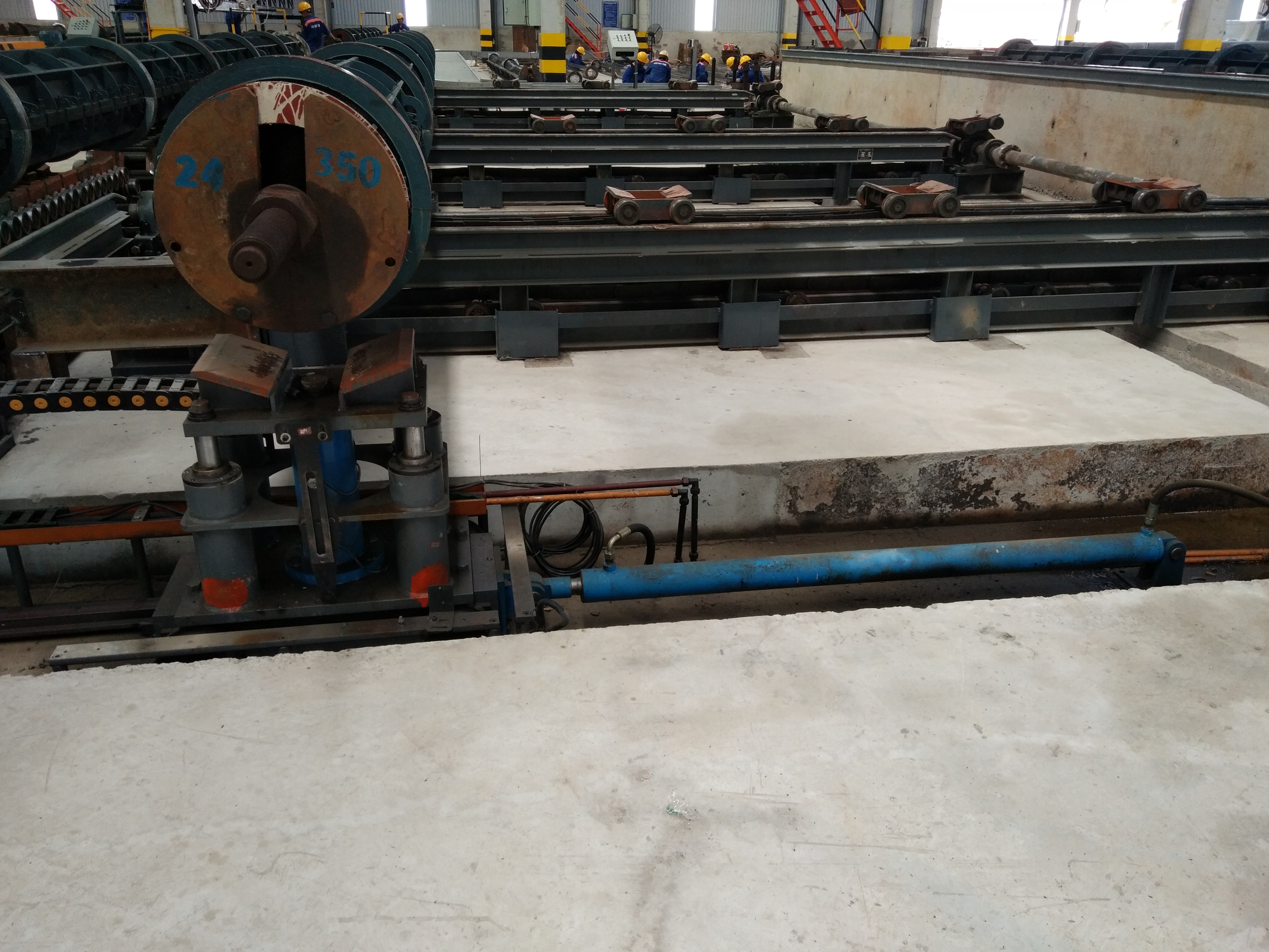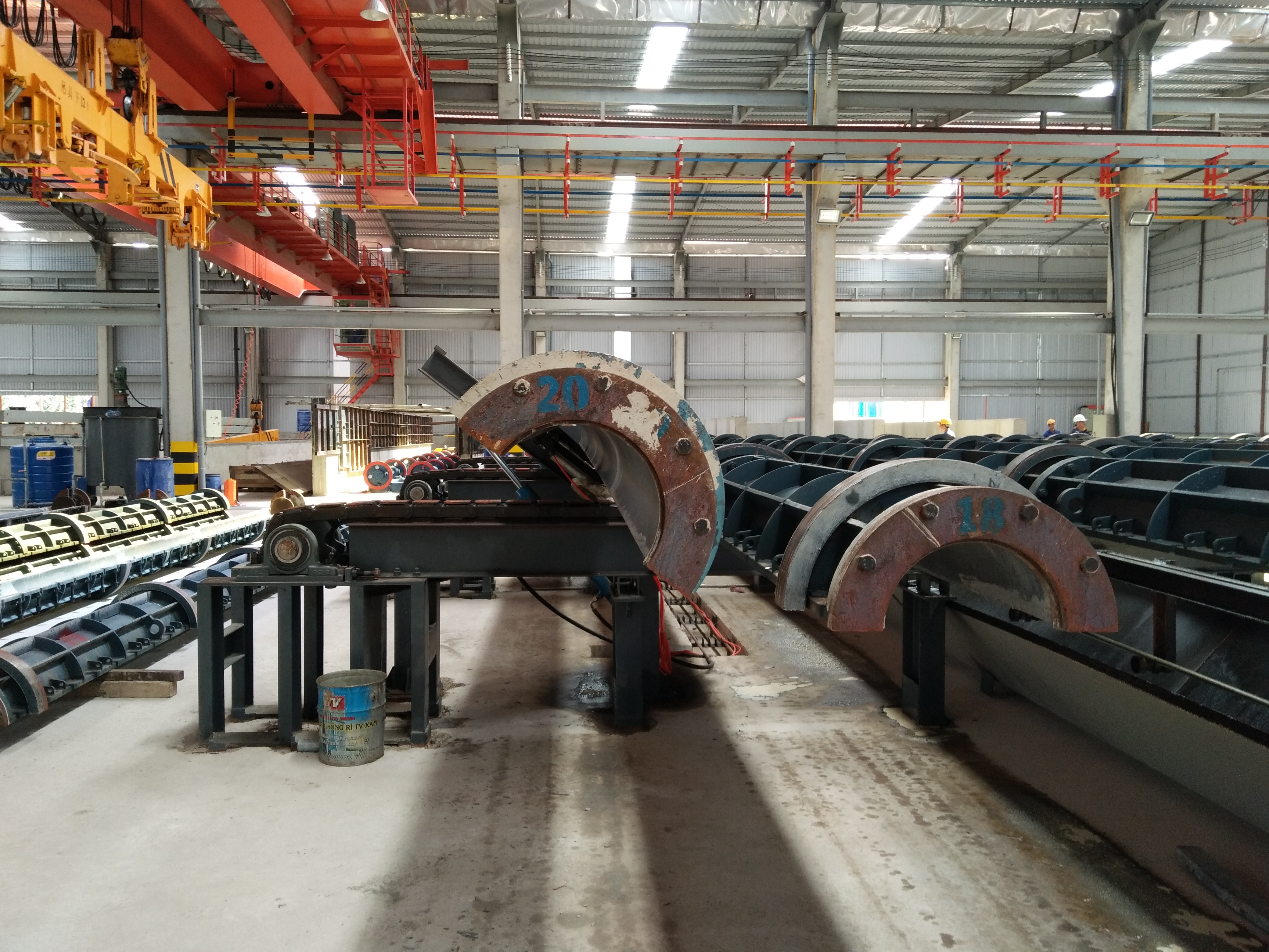 Process : concrete mixing – rebar cage – end plate welding & assembling – clamping – pumping – tensioning – spinning – steam curing – demolding – steam & pressure curing –  stocking